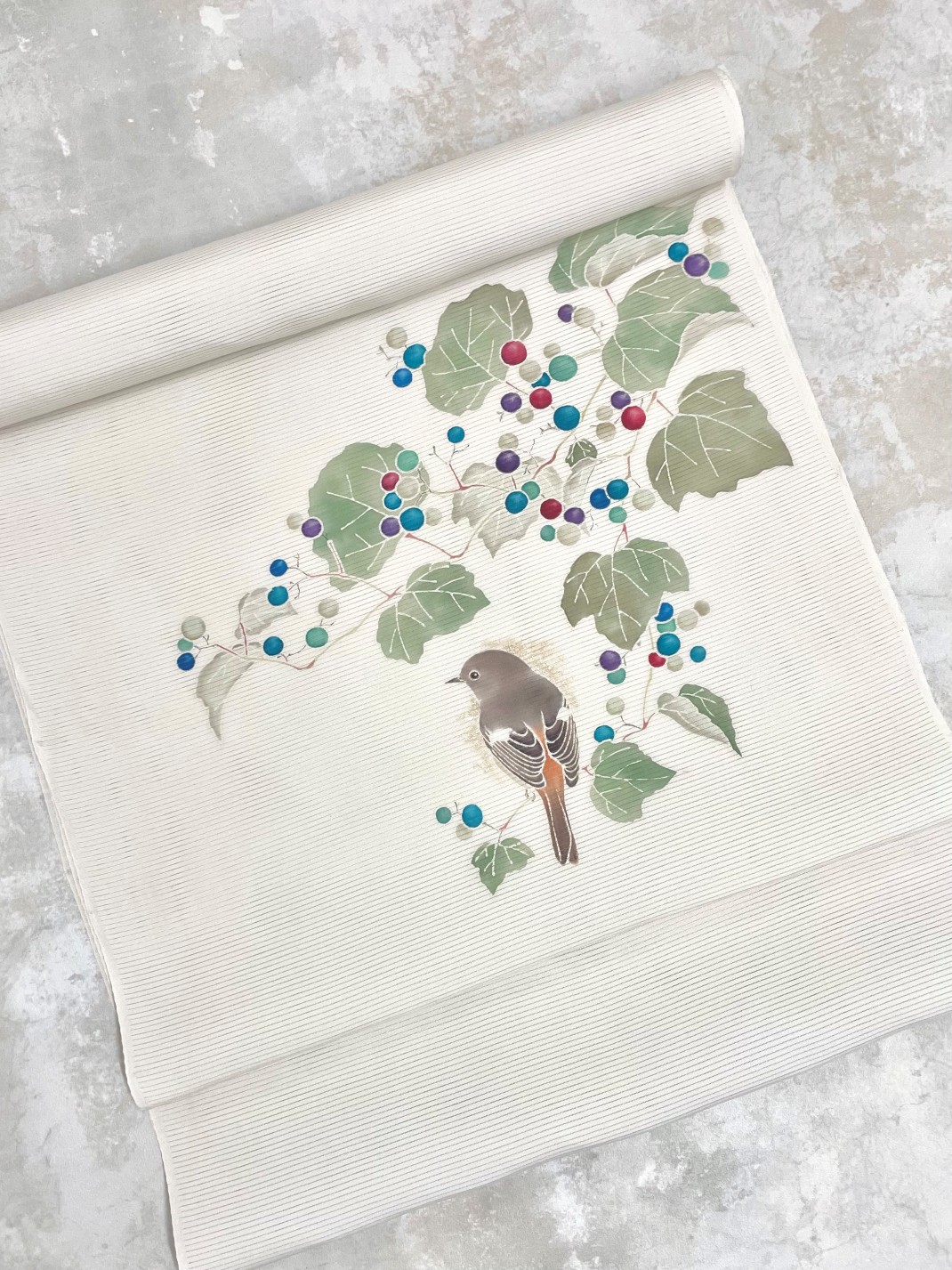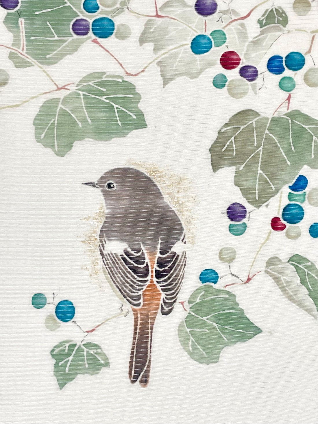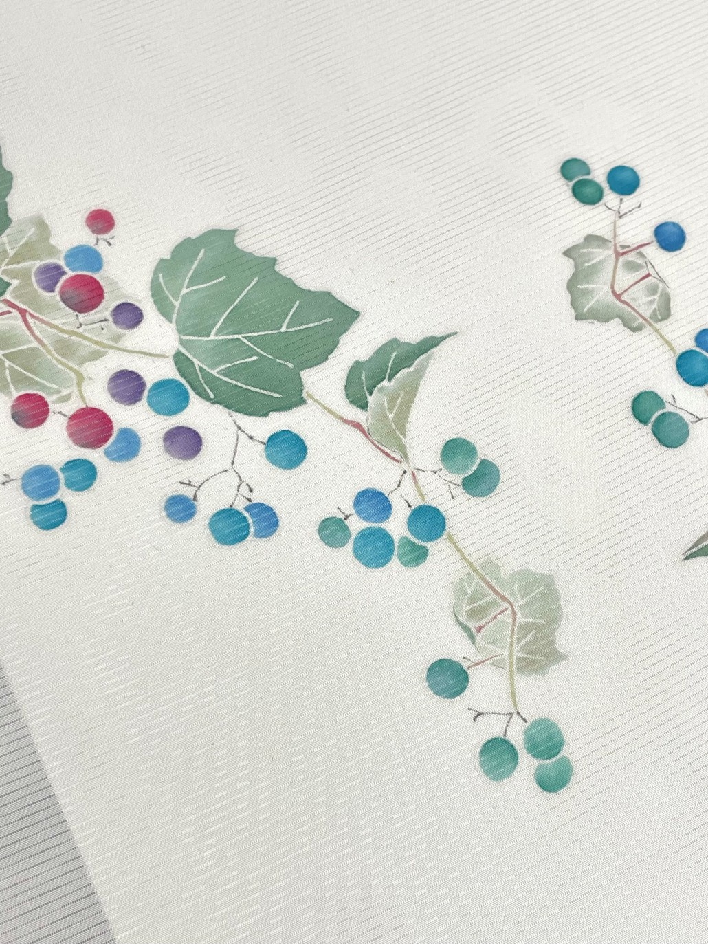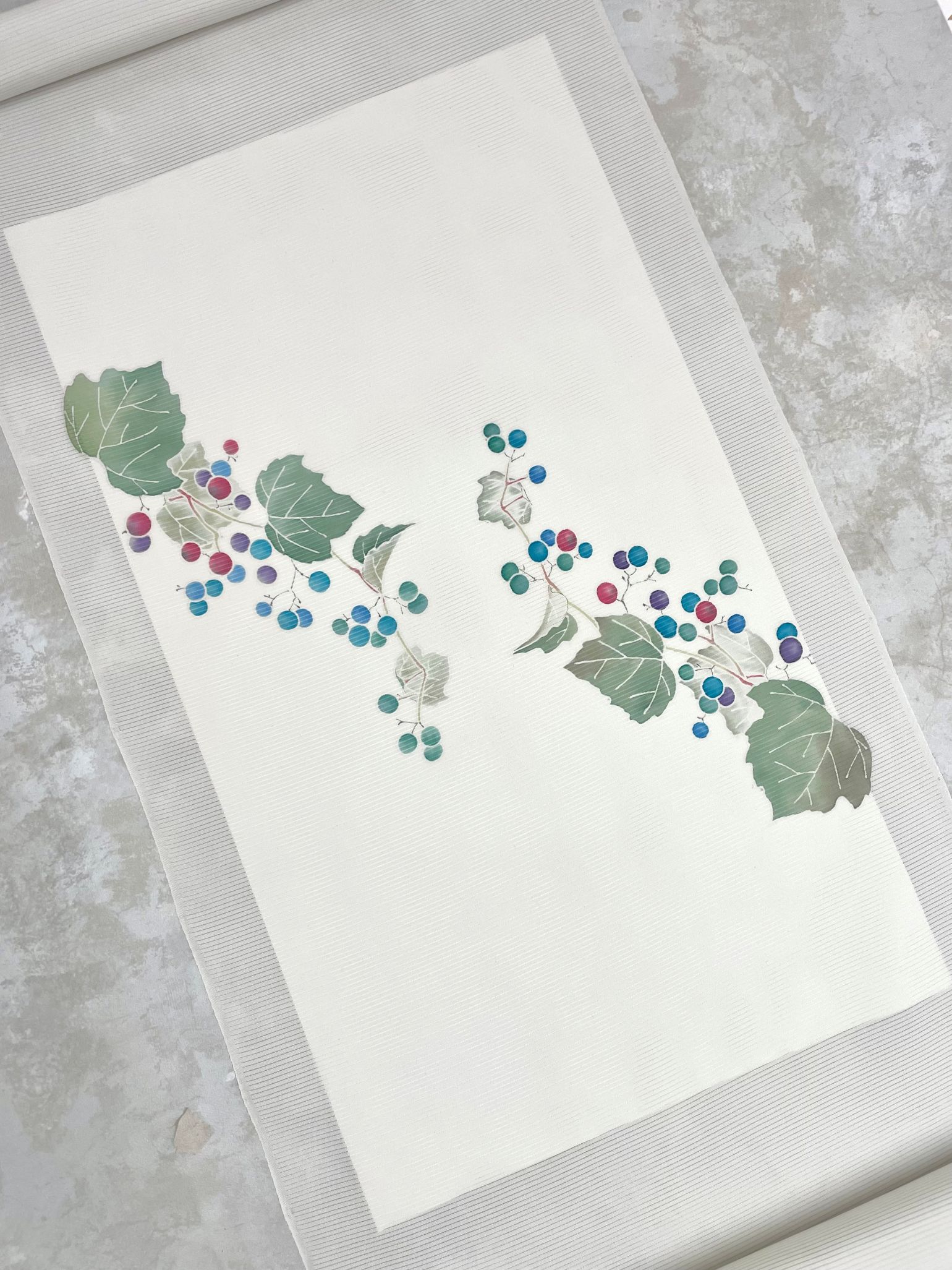 新古の駒絽に、宝石のような野葡萄をそのまま染めました。