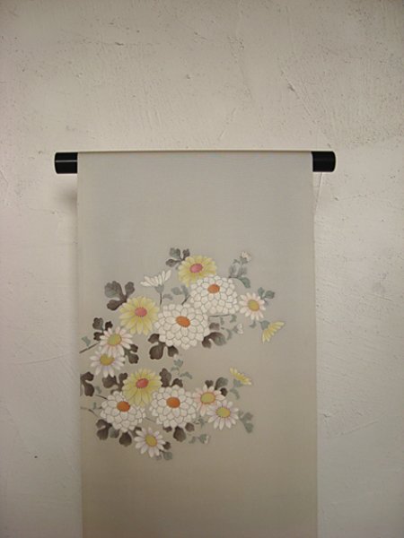 馥郁と香るような菊の花を、奇をてらわず、往年の逸品をイメージして染めました。今年の地色は、薄墨色、くちなし色、灰桜色、紫、の4本。こちらは灰桜色。この地色は落ち着いていて品がありつつ、縮緬のふっくらし…